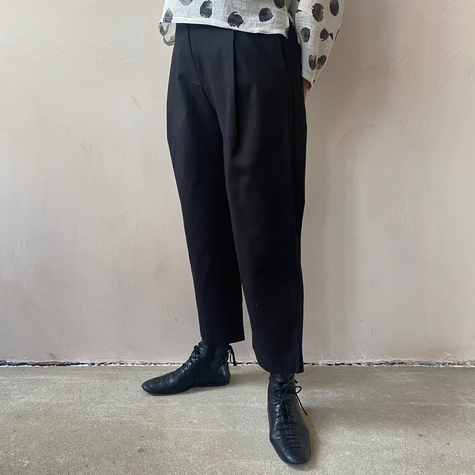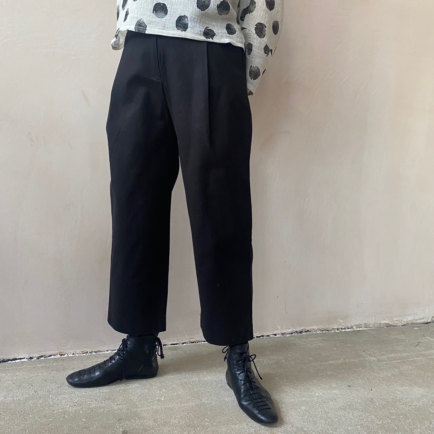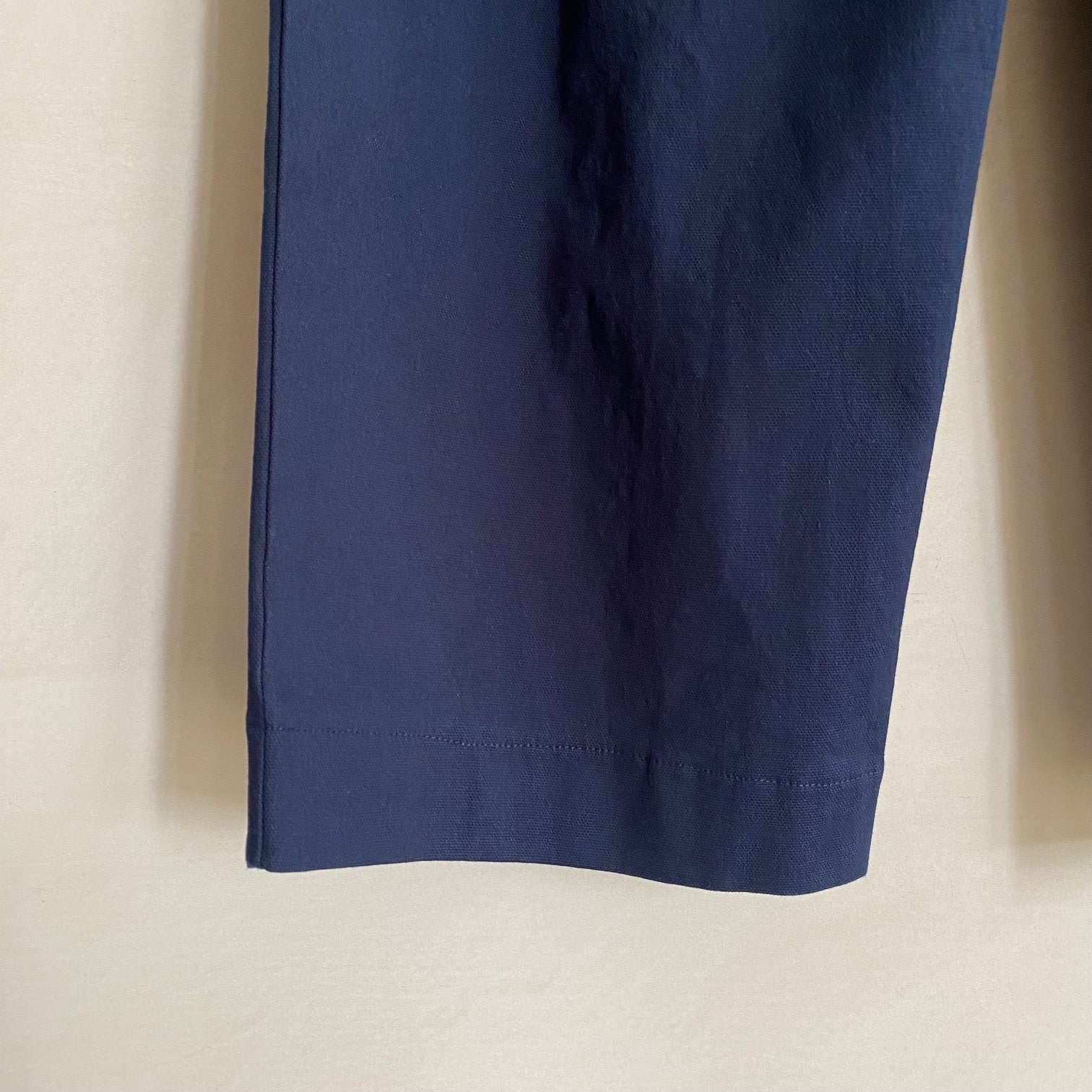 This trousers have flat pleats and hidden fly at the front that makes them nicely fitted at the waist. The legs are straight cut with a cropped length. The fabric has a little bit of spandex that makes these trousers very comfortable and able to move with your body without restriction. They can be easily dressed up or down as you can see from our pictures.