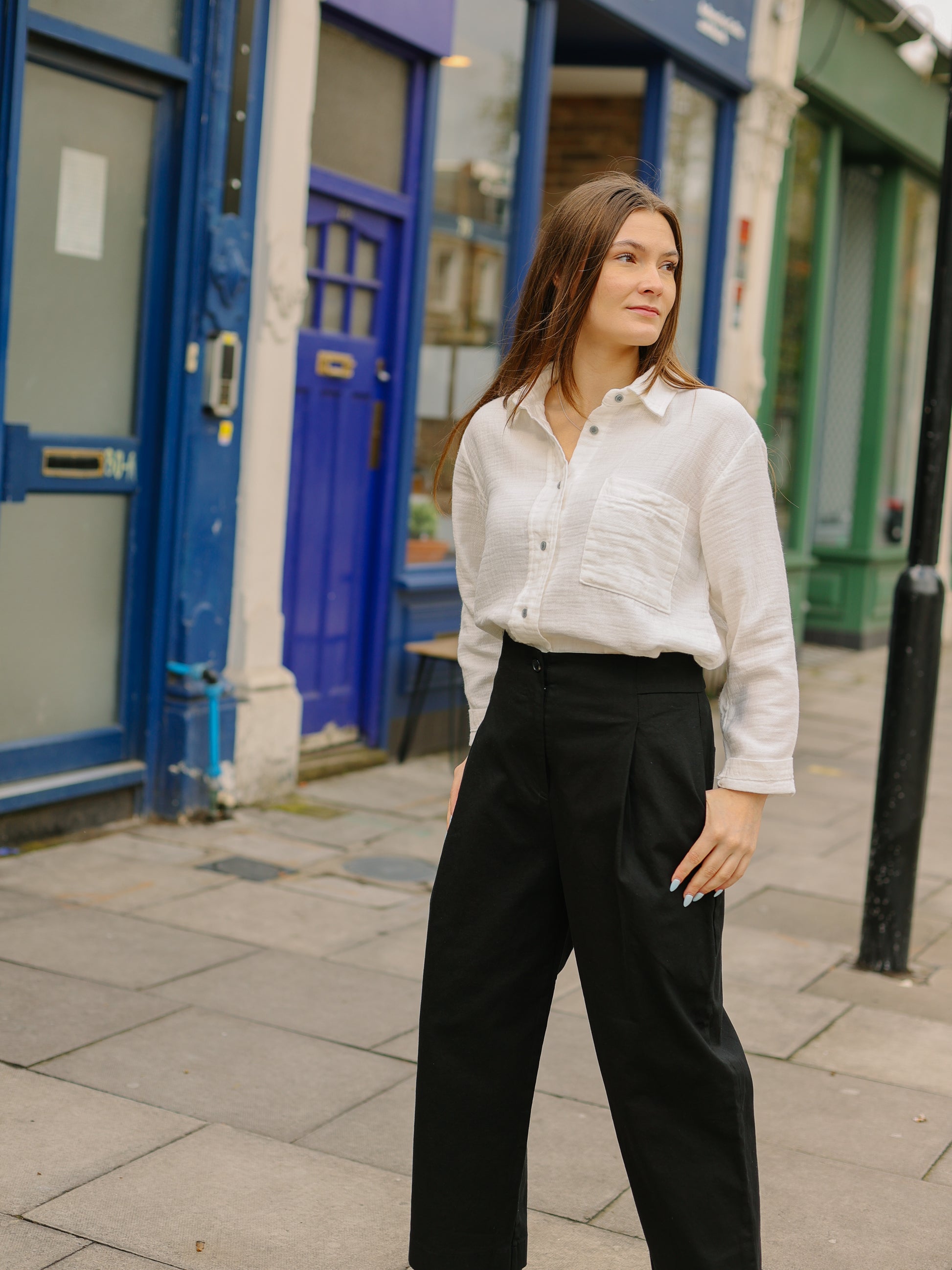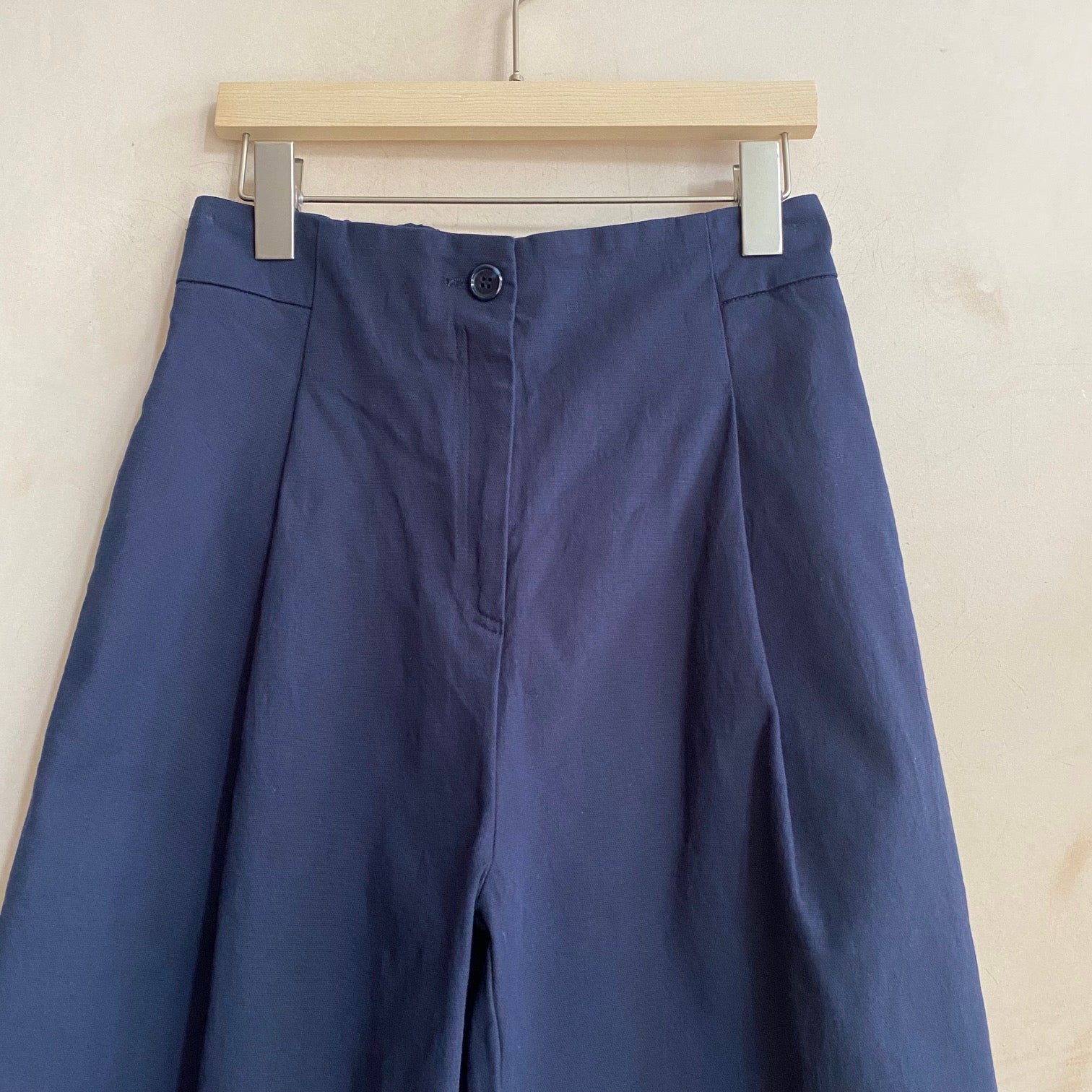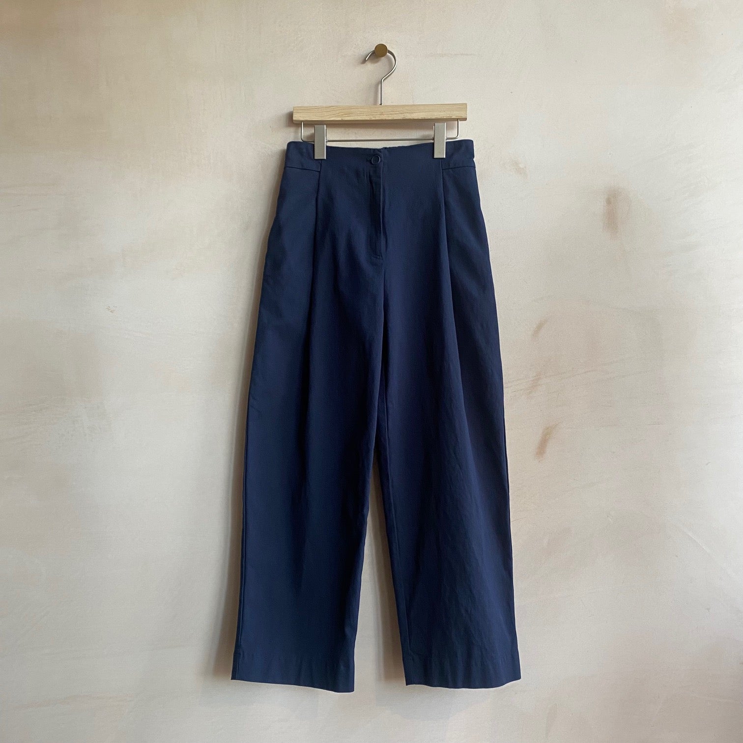 This trousers have flat pleats and hidden fly at the front that makes them nicely fitted at the waist. The legs are straight cut with a cropped length. The fabric has a little bit of spandex that makes these trousers very comfortable and able to move with your body without restriction. They can be easily dressed up or down as you can see from our pictures.