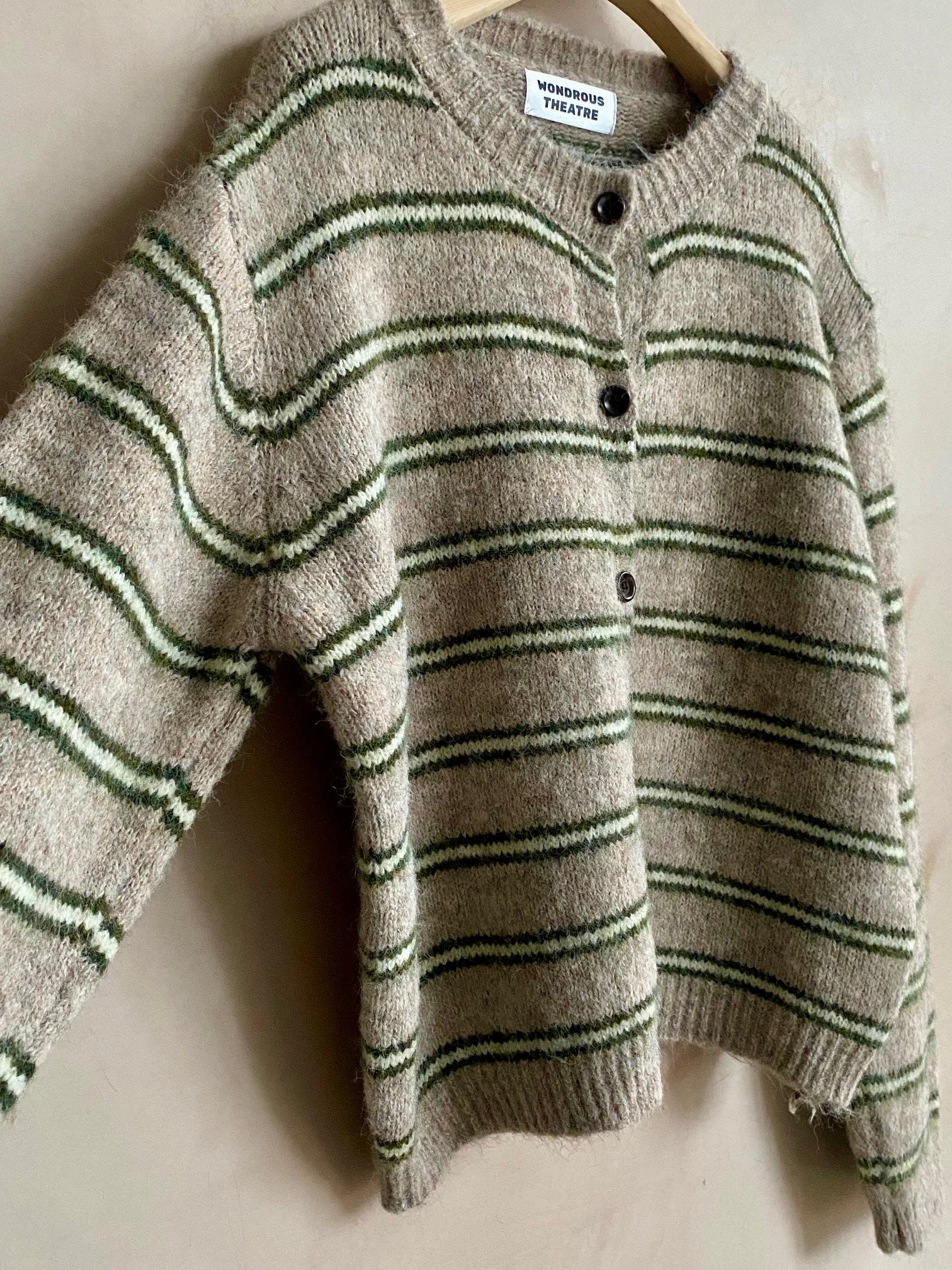 This cardigan has a lovely stripey pattern that adds fun to any outfit. It has a round neck and can be worn buttoned up or open. It’s also very soft and comfortable to wear. It has a relaxed body fit that looks great over trousers or skirts.