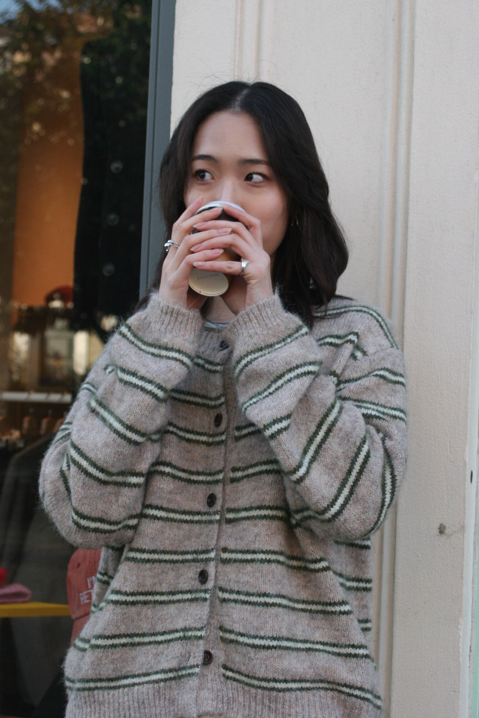 Stripe knit Cardi -Beige-