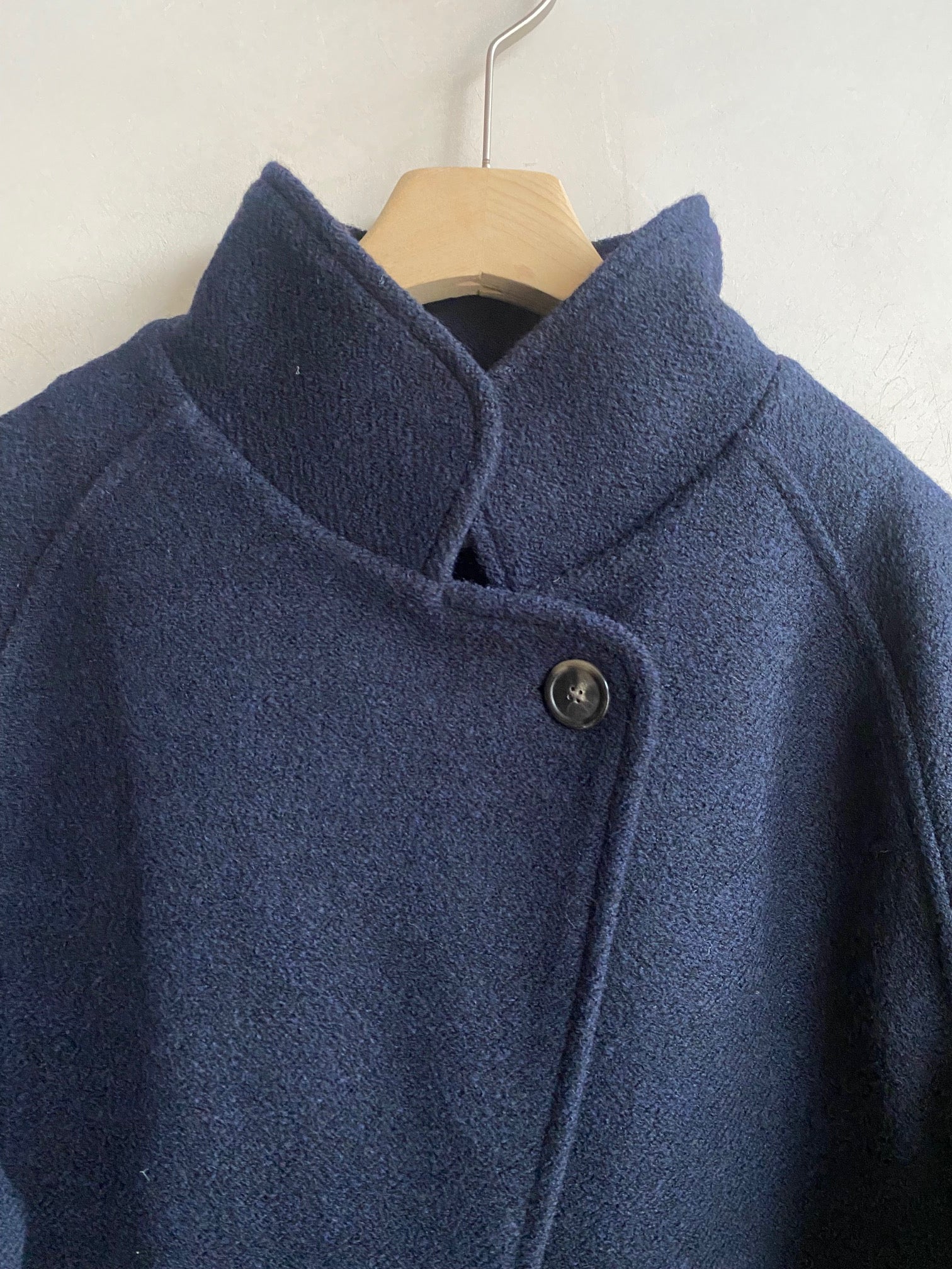 This coat has a very interesting texture as well as an unusual one button closure that is slightly wavy at the front. It has a nice structure and is made of wool for warmth.